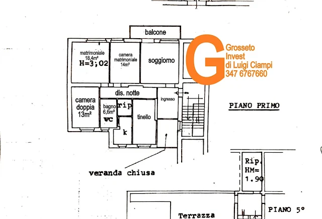 ingresso, veranda chiusa condonata, soggiorno con balcone, tinello con accesso alla veranda chiusa, cucinotto finestrato, ripostiglio disp., reparto notte con 3 camere grandi, un bagno.